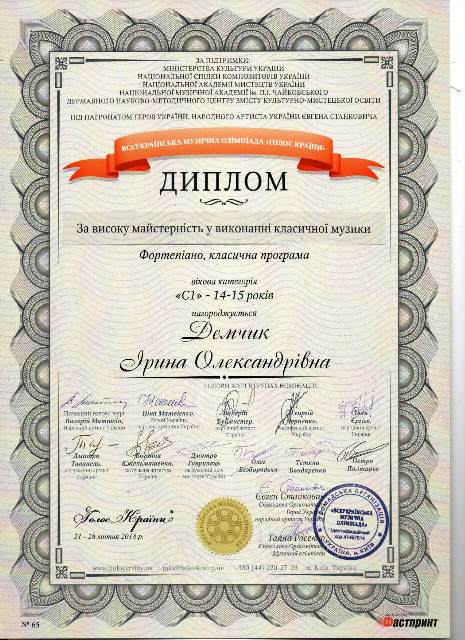 Вітаємо Вдовенко Олександру, студентку 1 курсу спеціальності "Музичне мистецтво", з отриманням призу "За музичність і художній образ"(клас викладача З. І. Міщенко).