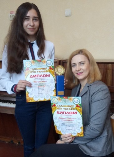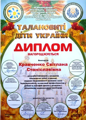 Викладач вокалу Кравченко С.С. нагороджена Дипломом за особистий внесок у розвиток талановитих дітей та молоді, надання їм можливості проявити свою індивідуальність, за високий професіоналізм у роботі та вагомий внесок у розвиток і збереження національного мистецтва.