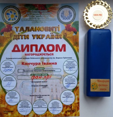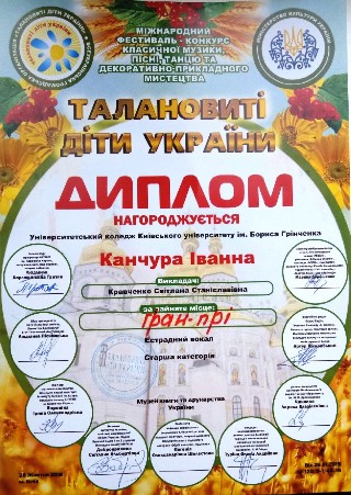 28 жовтня 2018 року студентка спеціальності «Музичне мистецтво» Канчура Іванна (I курс) виборола перемогу на Міжнародному фестивалі-конкурсі класичної музики, пісні, танцю та декоративно-прикладного мистецтва "Талановиті діти України" м. Київ у номінації «Естрадний вокал", старша категорія. Вона збагатила скарбничку Університетського коледжу Київського університету імені Бориса Грінченка дипломом Гран-Прі.