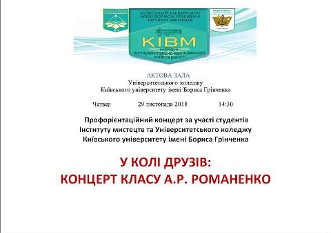 29 листопада 2018 року в актовій залі Університетського коледжу відбувся концерт «У колі друзів» класу А.Р. Романенко, кандидата культурології, доцента кафедри інструментально-виконавської майстерності, за участі студентів Інституту мистецтв та Університетського коледжу Київського університету імені Бориса Грінченка. Концерт носив профорієнтаційний характер. Студентів коледжу було проінформовано щодо змісту майбутньої професії, рівнів освіти, перспективи працевлаштування, ознайомлено з умовами вступу до Інституту мистецтв Київського університету імені Бориса Грінченка.