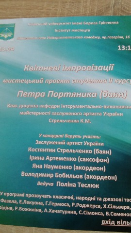 23 квітня 2019 року в рамках тісної співпраці циклової комісії музики і хореографії з кафедрою інструментально-виконавської майстерності Інституту мистецтв Київського університету імені Бориса Грінченка в актовій залі Університетського коледжу відбувся мистецький проект студента ІІ курсу Петра Портяника (баян) "Квітневі імпровізації" (клас доцента кафедри інструментально-виконавської майстерності заслуженого артиста України Стрельченка К.М.).