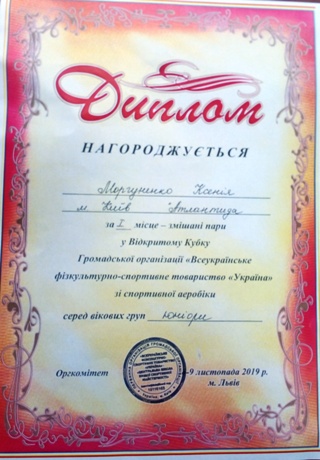 Щиро вітаємо Моргуненко Ксенію, студентку 2 курсу спеціальності "Хореографія", з перемогою: 1 місце - змішані пари у Відкритому кубку Громадської організації "Всеукраїнське фізкультурно-спортивне товариство "Україна" зі спортивної аеробіки серед вікових груп - юніори.