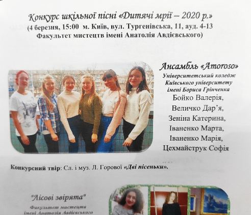 04-06 березня 2020 року на VII Міжнародному конкурсі імені Героя України, уславленого диригента, видатного музичного діяча маестро Анатолія Авдієвського «Як серцю виспівать себе», який відбувся у стінах НПУ ім.М.П. Драгоманова, студенти Університетського коледжу Київського університету імені Бориса Грінченка посіли призові місця.