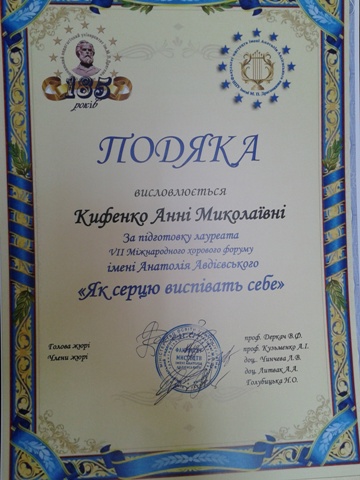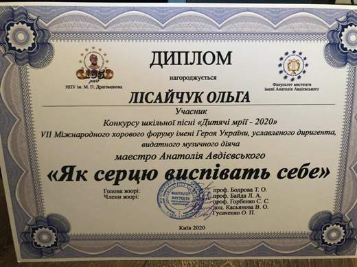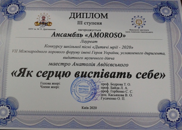 Щиро вітаємо вокальний ансамбль «Amoroso» у складі В. Бойко, Д. Величко, К. Зеніної, Марти Іваненко, Марії Іваненко, С. Цехмайструк з перемогою в конкурсі шкільної пісні «Дитячі мрії – 2020» (почесна грамота лауреата ІII ступеня); Вдовенко Олександру з перемогою у конкурсі хорових диригентів (почесна грамота лауреата ІII ступеня); Лісайчук Ольгу, яка брала участь у конкурсі хорових диригентів та конкурсі шкільної пісні, здобувши диплом лауреата Міжнародного конкурсу.