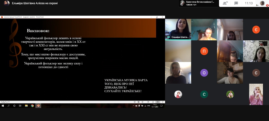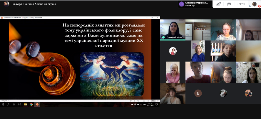 13 листопада 2020 року відбулося відкрите заняття викладача Алієвої Е.Ш. з навчальної дисципліни Українська музична література у групі ММфмб-1-20-4.0д