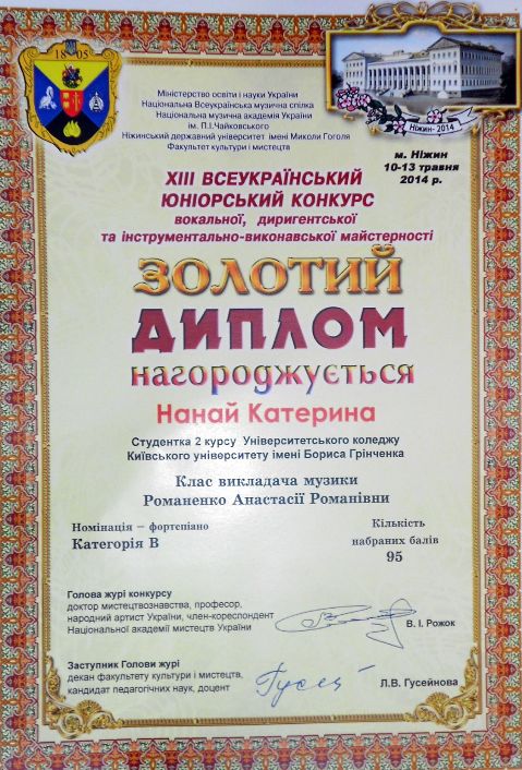 НАНАЙ КАТЕРИНУ (ІІ курс, фортепіано, Золотий диплом лауреата)