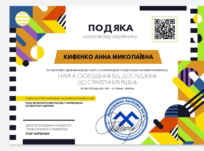 26 листопада 2021 р. студенти спеціальності «Музичне мистецтво» Супряга Ольга та Зеніна Катерина на чолі з науковим керівником кан.пед.наук Кифенко А.М. взяли участь у III Міжнародній студентській науковій конференції «НАУКА СЬОГОДЕННЯ: ВІД ДОСЛІДЖЕНЬ ДО СТРАТЕГІЧНИХ РІШЕНЬ».