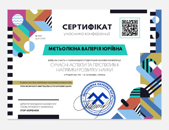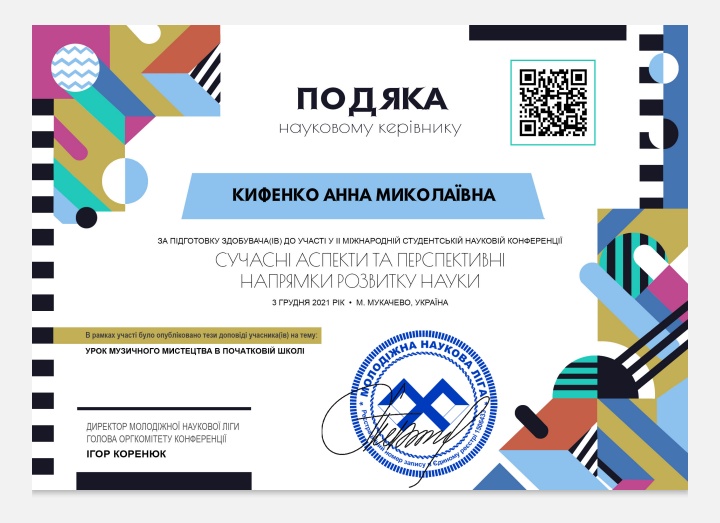 03 грудня 2021 р. студенти спеціальності «Початкова освіта» та «Музичне мистецтво» Мєтьолкіна Валерія, Іваненко Марта-Елеонора на чолі з науковим керівником кан.пед.наук Кифенко А.М. взяли участь у II Міжнародній студентській науковій конференції «Сучасні аспекти та перспективні напрямки розвитку науки».