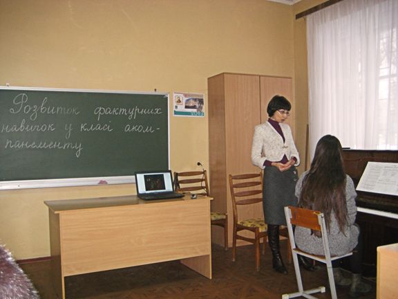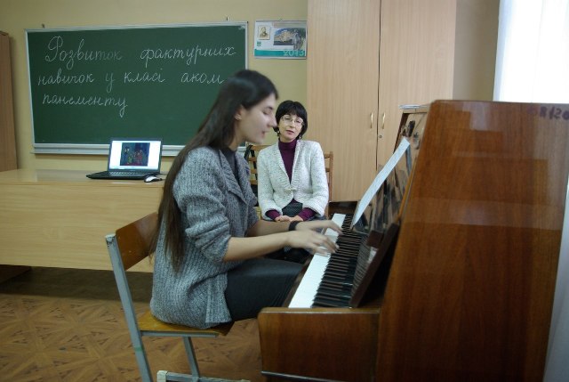 4 грудня відбулося відкрите заняття з навчальної дисципліни "Акомпанемент" викладача Куцан О.Г. зі студенткою ІІ курсу спеціальності "Музичне мистецтво" Рузметовою Юлією. Тема заняття "Розвиток фактурних навичок у класі акомпанементу" охоплювала проблеми підбору акомпанементу до пісень педагогічного репертуару. В процесі заняття були продемонстровані методи розвитку гармонійного слуху, вправи для оволодіння клавіатурою, фактурні вправи. Крім того, була показана робота над формуванням концертмейстерських навичок на прикладі російського романсу "Утро туманное" (муз. А.Абаза, сл. І.Тургенєва).