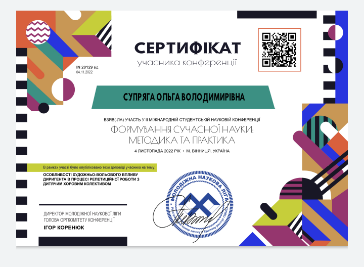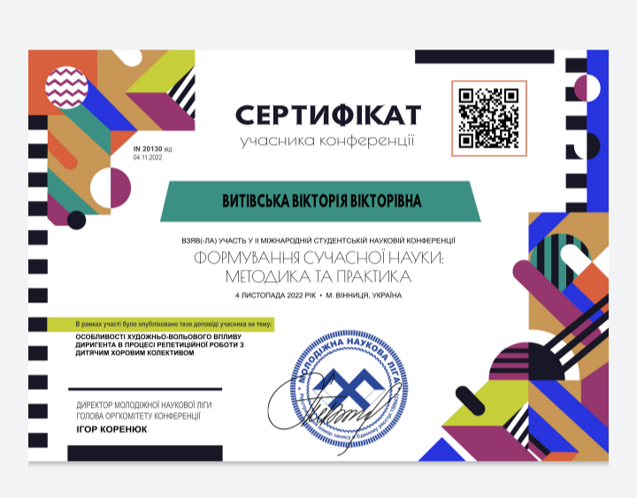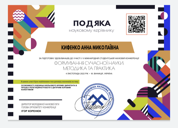 04.11.2022 року студенти спеціальності "Музичне мистецтво" Супряга Ольга, Витівська Вікторія та Орел Анна взяли у часть у II Міжнародній студентській науковій конференції "Формування сучасної науки: методика та практика".