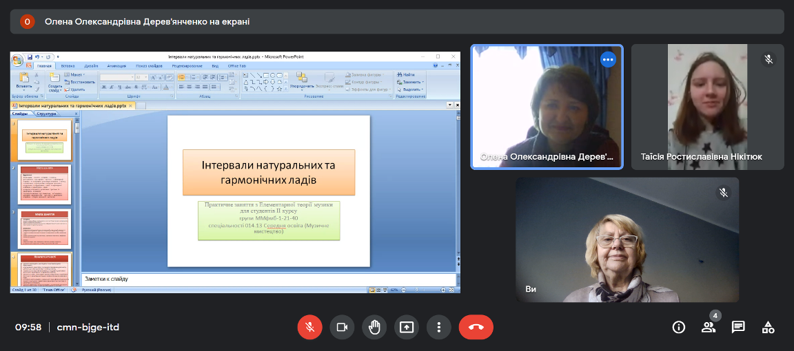 09.12.2022 року відбулося відкрите заняття викладача Дерев’янченко О.О. з навчальної дисципліни «Елементарна теорія музики» на тему «Інтервали натуральних і гармонічних ладів». Заняття проводилось з групою ММфмб-1-21-4.0д.