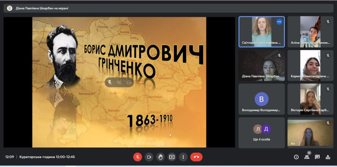 08.12.2022 року у групі ХОРфмб-1-21-4.0д відбулася кураторська година на тему «Він більше працював, ніж жив». Захід присвячений вшануванню пам’яті видатного українського письменника, педагога, літературознавця, етнографа, історика, публіциста, громадсько-культурного діяча Бориса Дмитровича Грінченка.