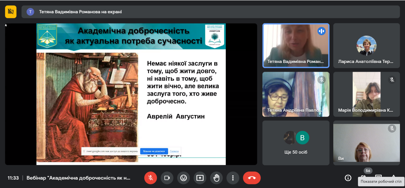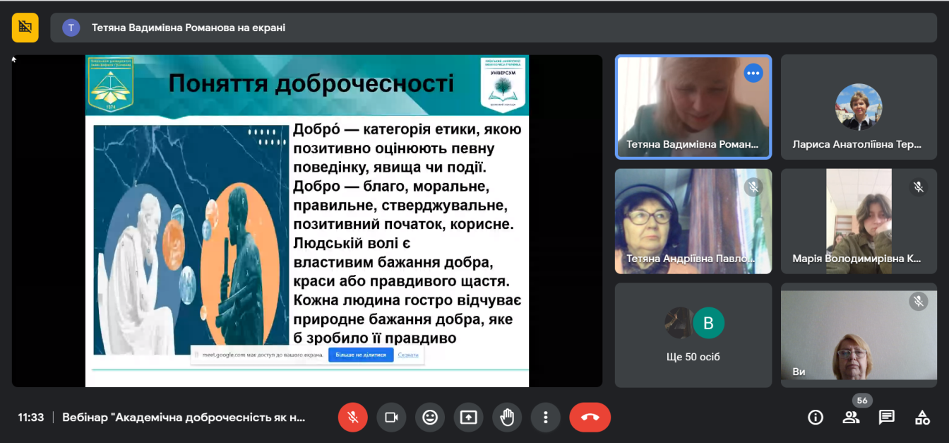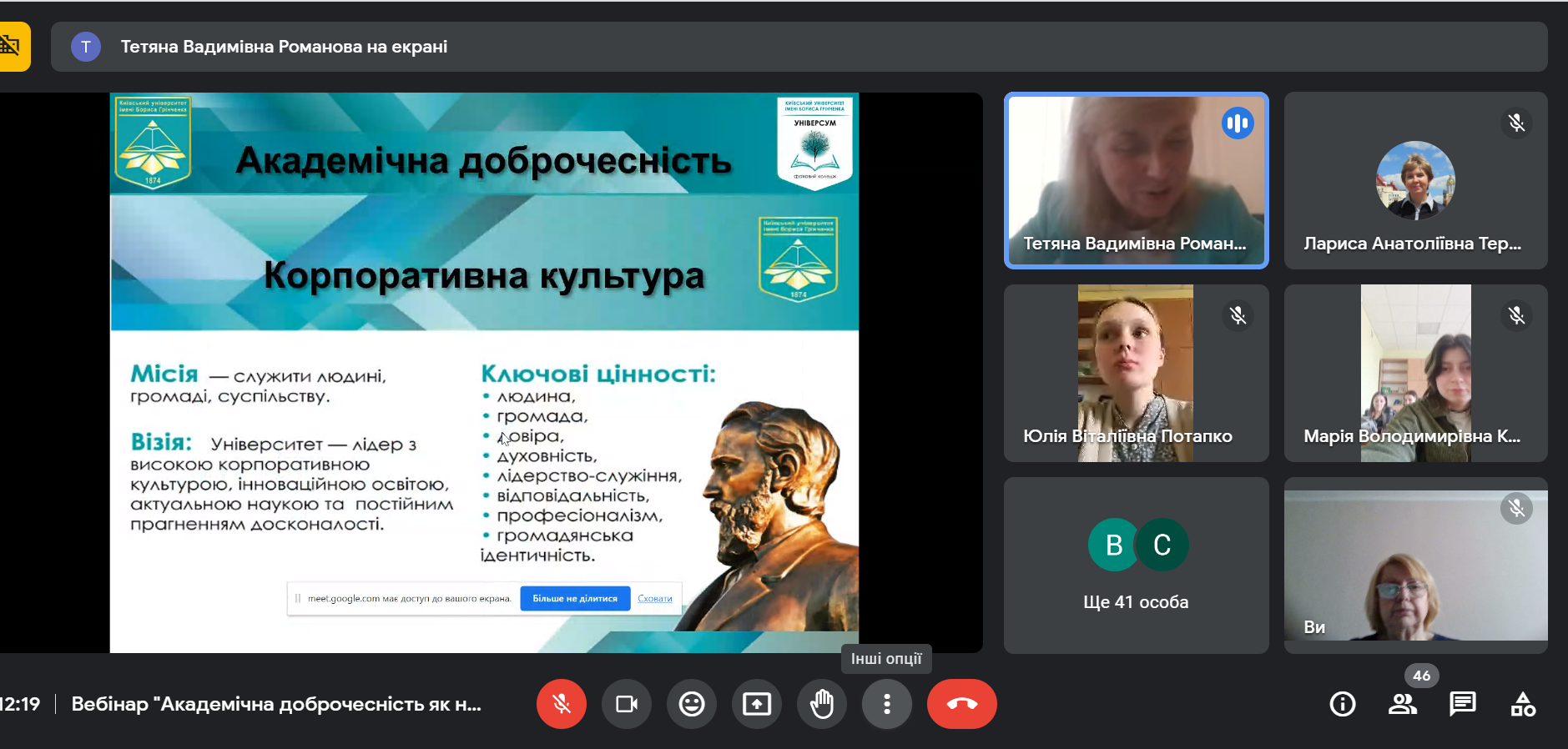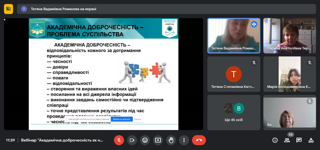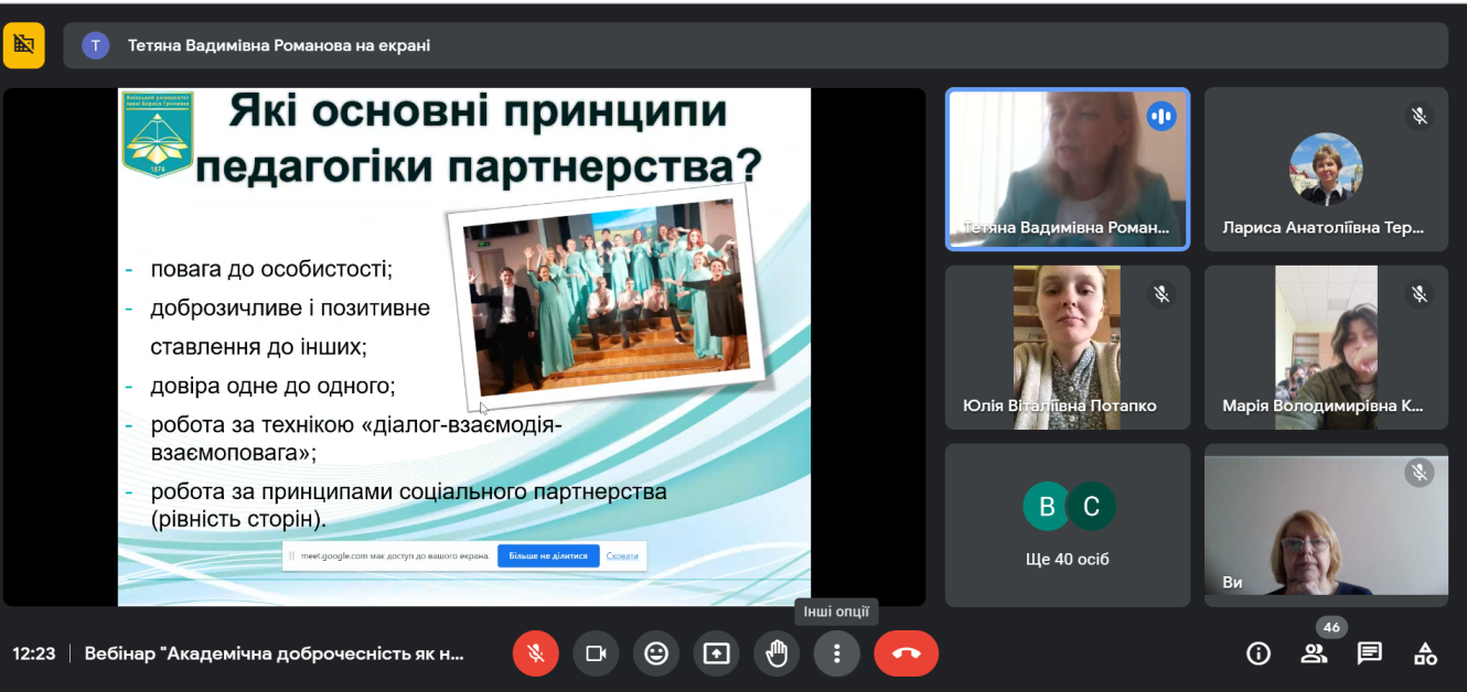 17.05.2023 року в рамках Фестивалю науки для викладачів циклової комісії музики і хореографії та студентів спеціальності "Музичне мистецтво" і "Хореографія" було проведено вебінар "Академічна доброчесність як норма корпоративної культури Університету Грінченка". Мета заходу полягала в розкритті змісту та ролі академічної доброчесності як важливого компонента корпоративної культури Університету, визначенні важливості дотримання фундаментальних принципів академічної доброчесності в освітньому процесі.