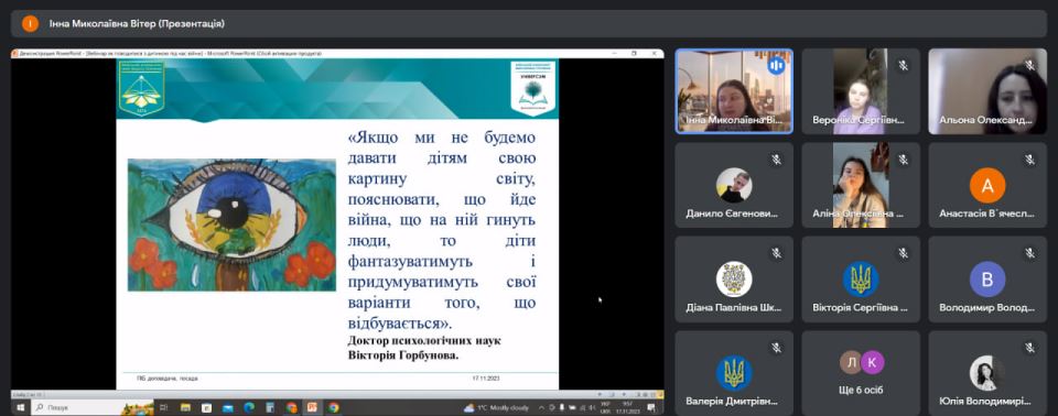 17 листопада 2023 року в рамках соціального проєкту "Війна не відміняє дитинство" практичний психолог Коледжу Вітер І.М. провела відкритий вебінар "Як говорити та поводитися з дітьми під час війни?", де підняла важливі питання адаптації дітей молодшого шкільного віку до військових дій в Україні та підримки дітей, які постійно знаходяться у стані тривоги.