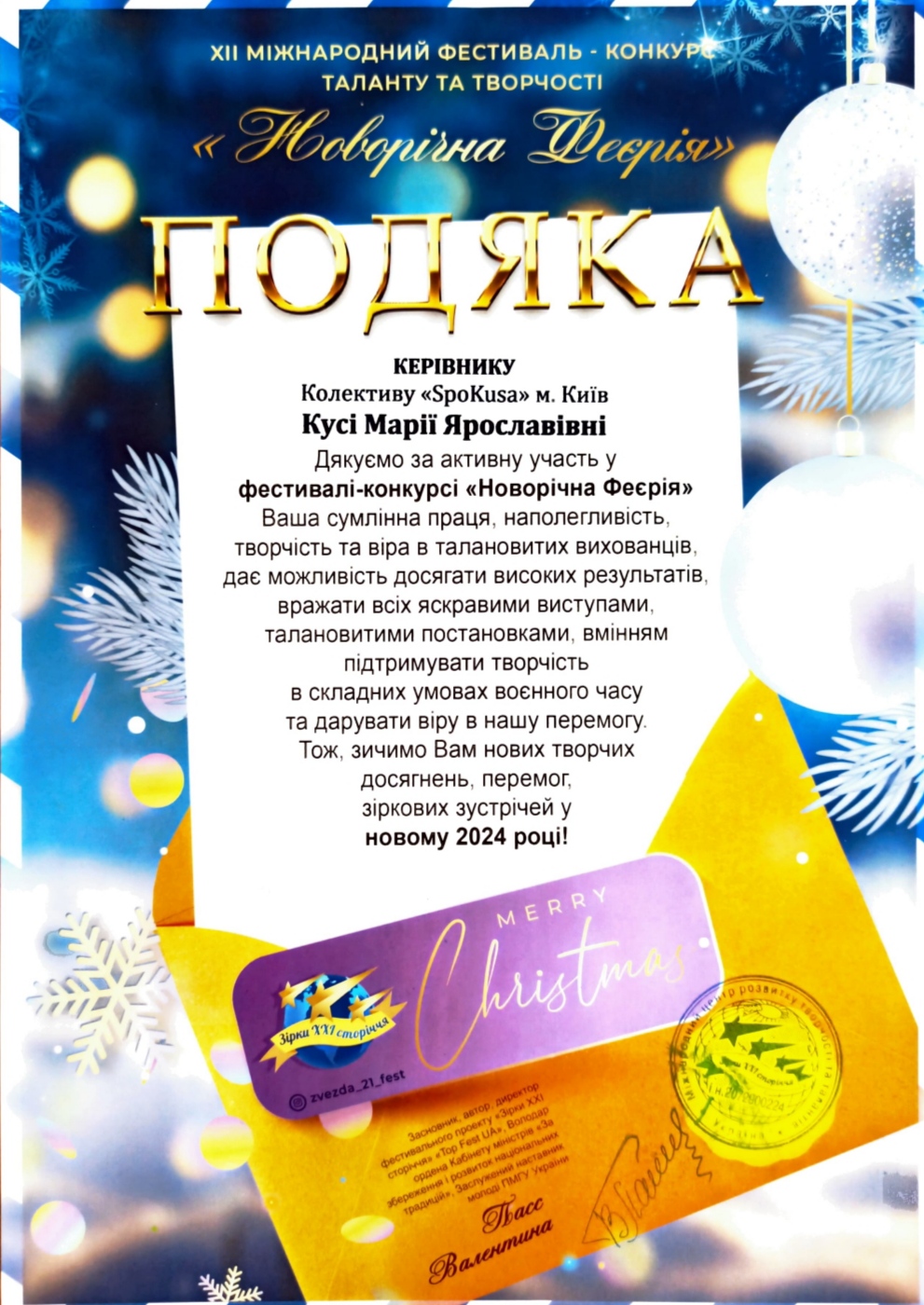 22-25 грудня 2023 року в місті Дніпро відбувся XII міжнародний фестиваль-конкурс таланту та творчості "Новорічна феєрія".