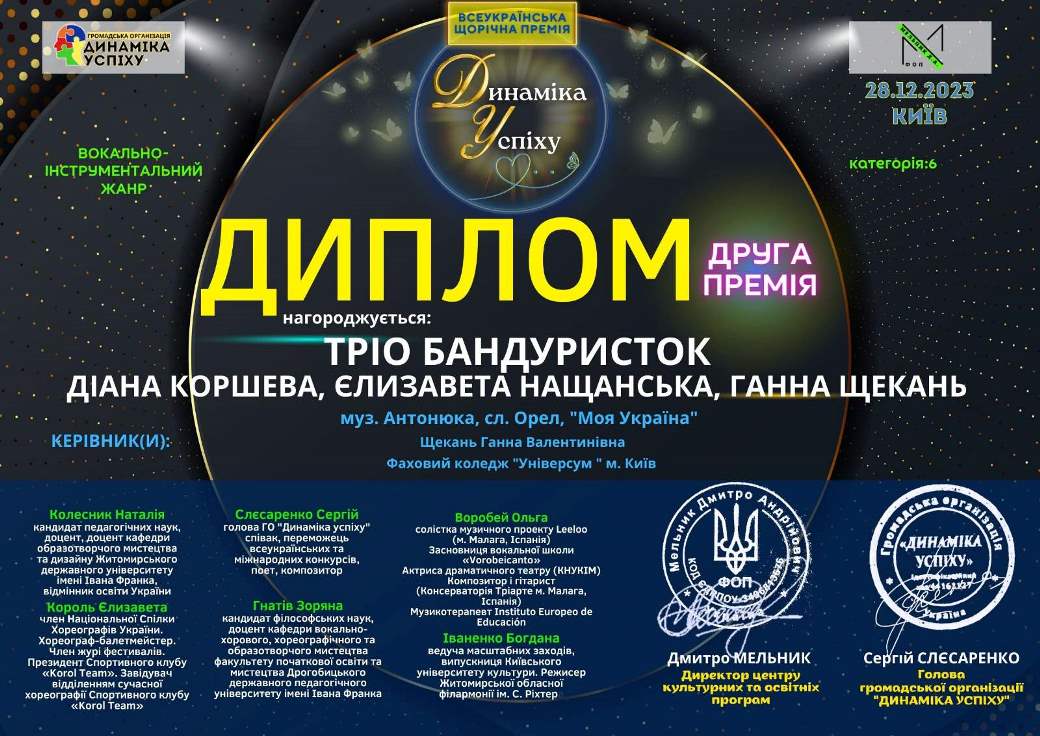 28 грудня 2023 року тріо бандуристок у складі студентів 1 курсу Коршевої Діани та 4 курсу Нащанської Єлизавети, викладачки Щекань Ганни Петрівни взяли участь у конкурсі "Всеукраїнська щорічна премія "Динаміка успіху" у номінації "Вокально-інструментальний жанр".