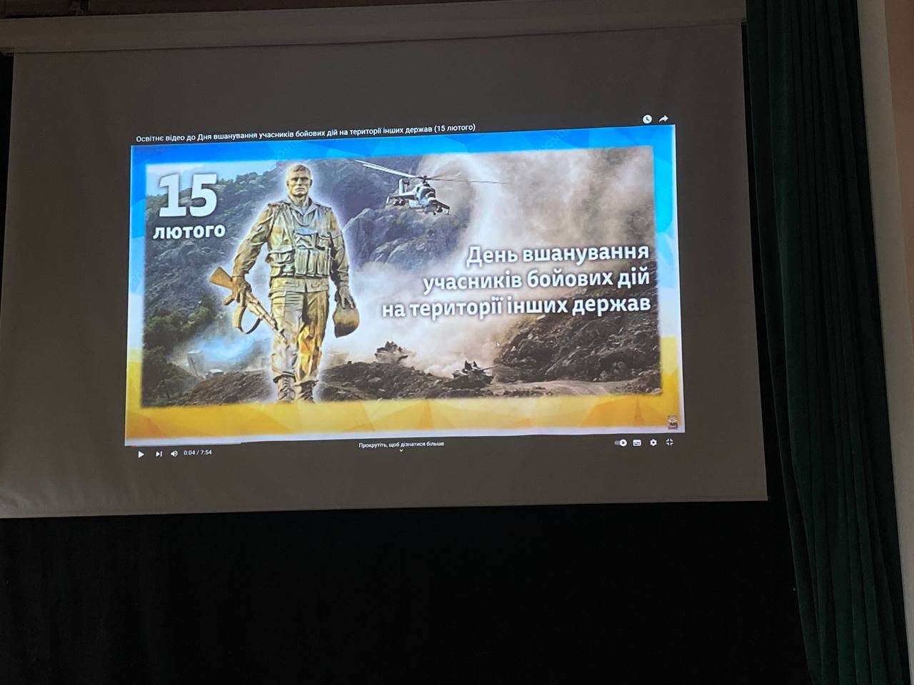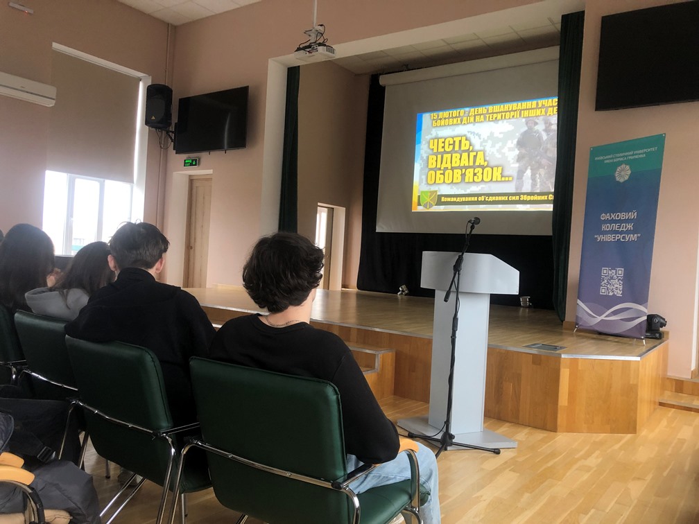 15.02.2024 року відбулася кураторська година, присвячена Дню вшанування пам’яті учасників бойових дій на території інших держав. У виховній годині брали участь студенти 2 курсу спеціальності "Хореографія". В рамках заходу учасники дивилися документальний фільм «Честь, відвага, обов’язок», захоплено обговорювали подвиги наших солдат, були вражені мужнім внеском українських героїв у забезпечення миру та стабільності у всьому світі.