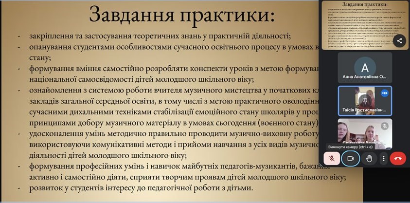 28 листопада 2024 року відбулася звітна конференція за результатами проходження навчальної практики «Пробні уроки та заняття» студентами 4 курсу спеціальності 014.13 Середня освіта (Музичне мистецтво) за участю керівника практики Романової Тетяни Вадимівни, голови циклової комісії музики і хореографії та гаранта освітньої програми.