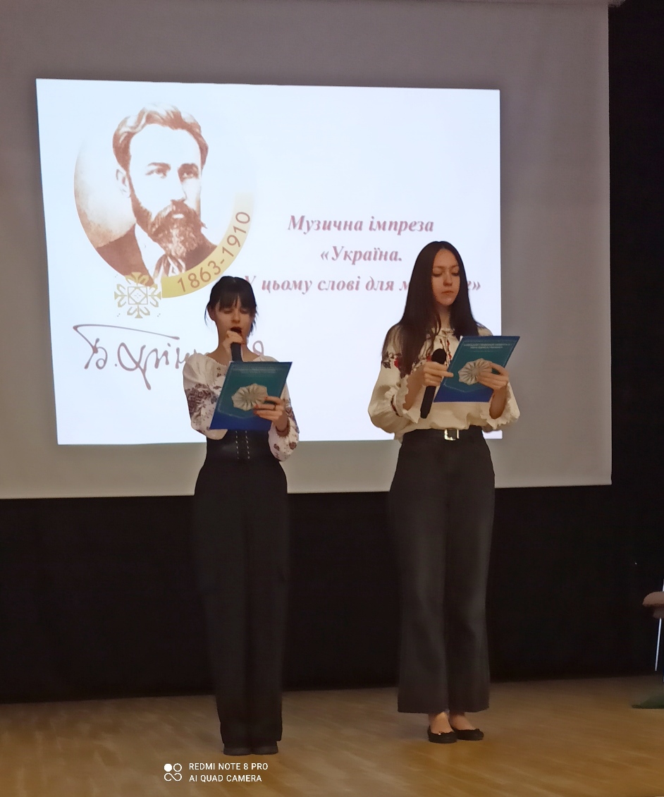 09.12.2024 року в актовій залі Фахового коледжу «Універсум» Київського столичного університету імені Бориса Грінченка відбулася музична імпреза «Україна. У цьому слові для мене все», присвячена 161-й річниці з дня народження українського письменника, фольклориста, етнографа, лексикографа, мовознавця, педагога, борця за українську незалежність Бориса Грінченка.