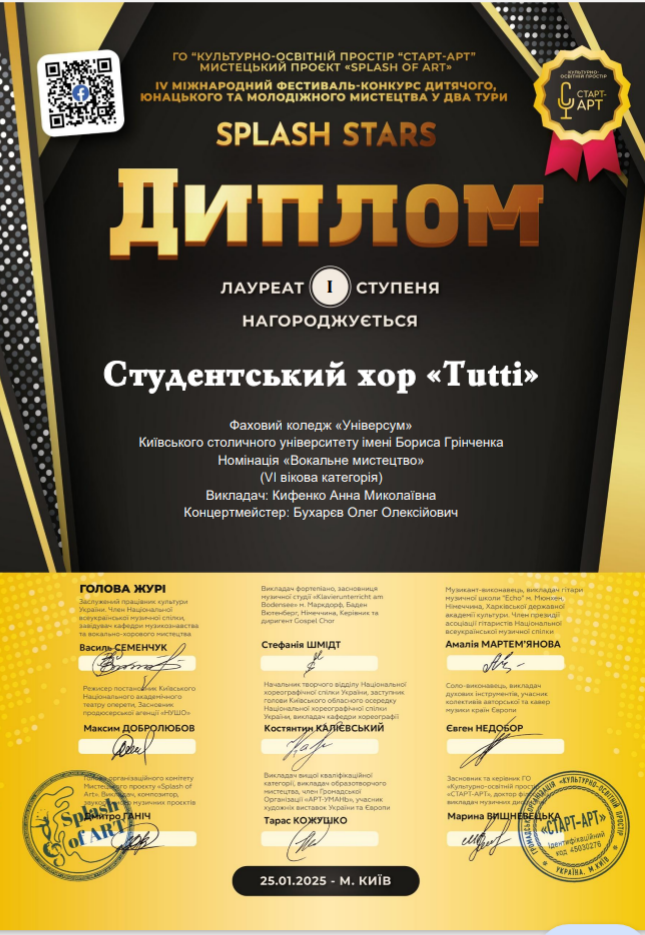 25.01.2025 року студентський хор "Tutti" взяв участь у ІV Міжнародному фестивалі-конкурсі дитячого, юнацького та молодіжного мистецтва SPLASH STARS, в якому здобув перемогу і отримав диплом І ступеня.