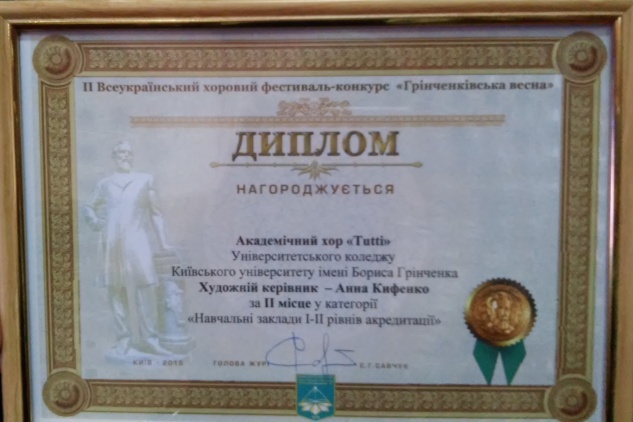 14 травня 2015 року у Національному педагогічному університеті імені М.П. Драгоманова відбувся Регіональний фестиваль студентських і дитячих хорових колективів "Якщо заспіває школа - заспіває країна". Академічний хор "Tutti" Університетського коледжу Київського університету імені Бориса Грінченка взяв участь у даному фестивалі та виборов III місце у номінації "Камерні хори". Вітаємо переможців!!!