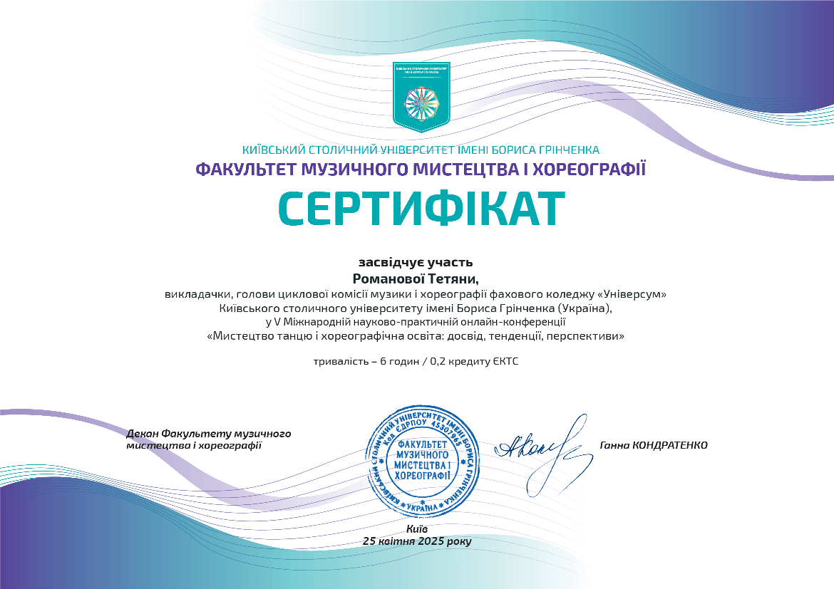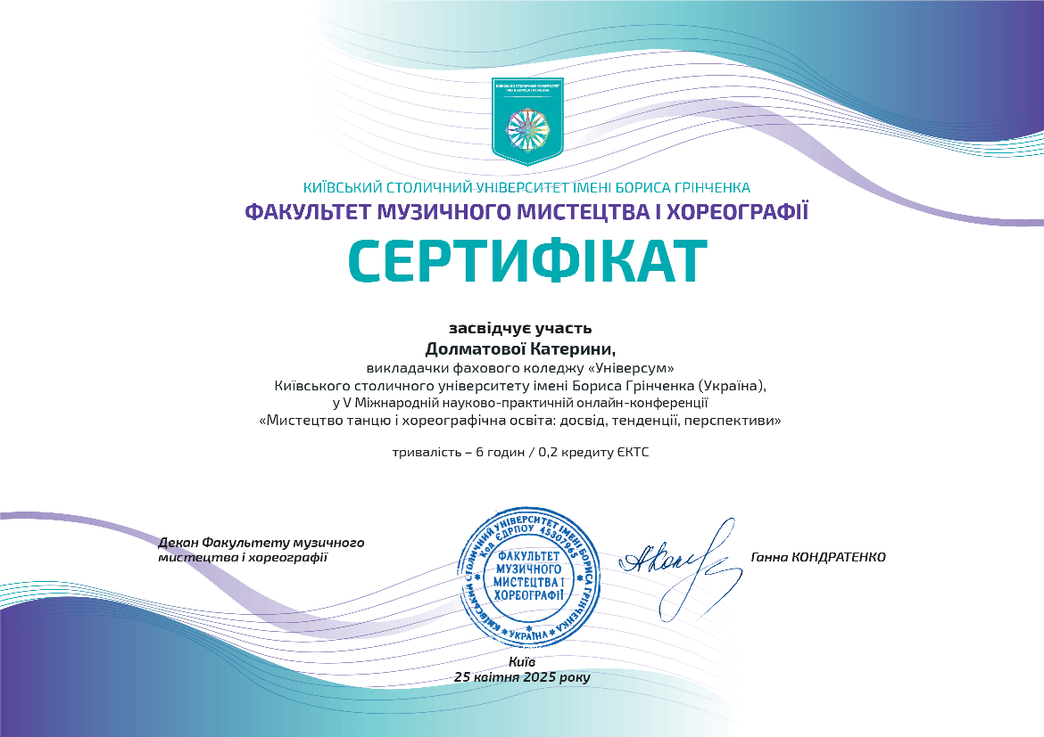 25 квітня 2025 року на кафедрі хореографії Факультету музичного мистецтва і хореографії Київського столичного університету імені Бориса Грінченка відбулася V Міжнародна науково-практична онлайн-конференція"Мистецтво танцю і хореографічна освіта: досвід, тенденції, перспективи».