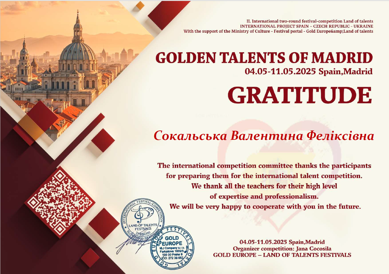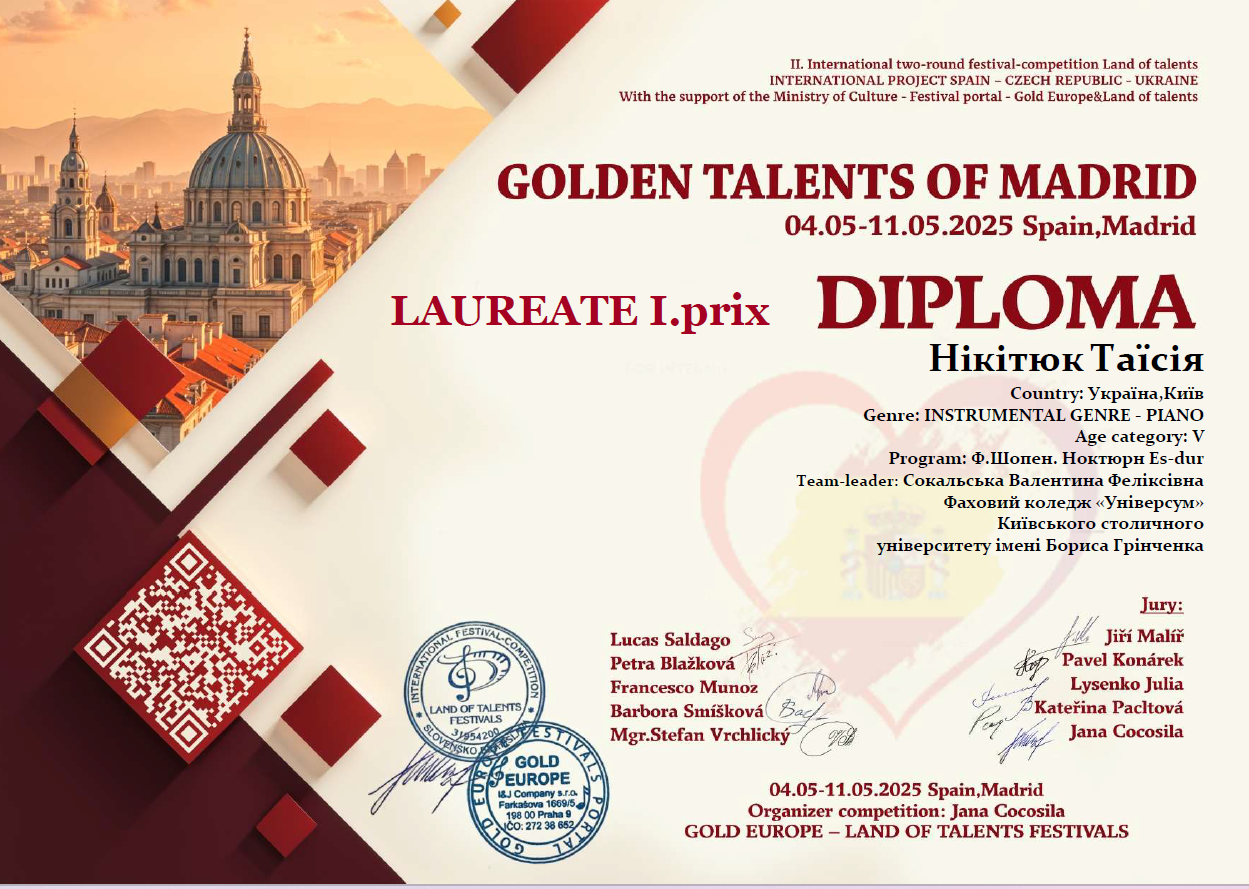 В травні 2025 року відбувся міжнародний двотуровий фестиваль-конкурс «GOLDEN TALENTS OF MADRID» (Мадрід, Іспанія), в якому отримала переможне перше місце студентка 4 курсу спеціальності «Музичне мистецтво» НІКІТЮК ТАЇСІЯ.