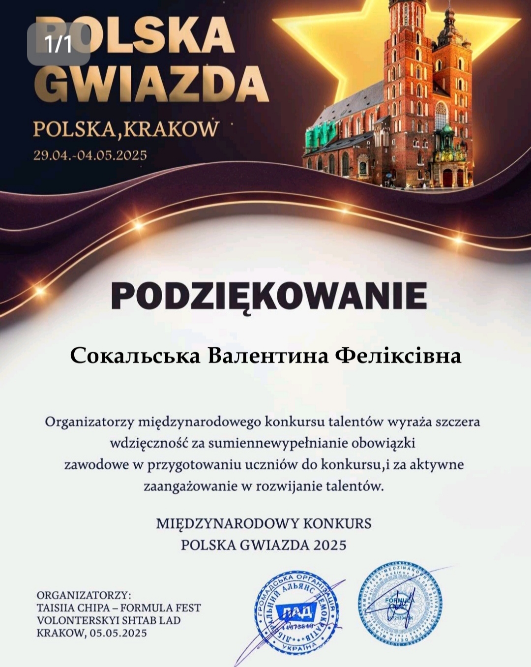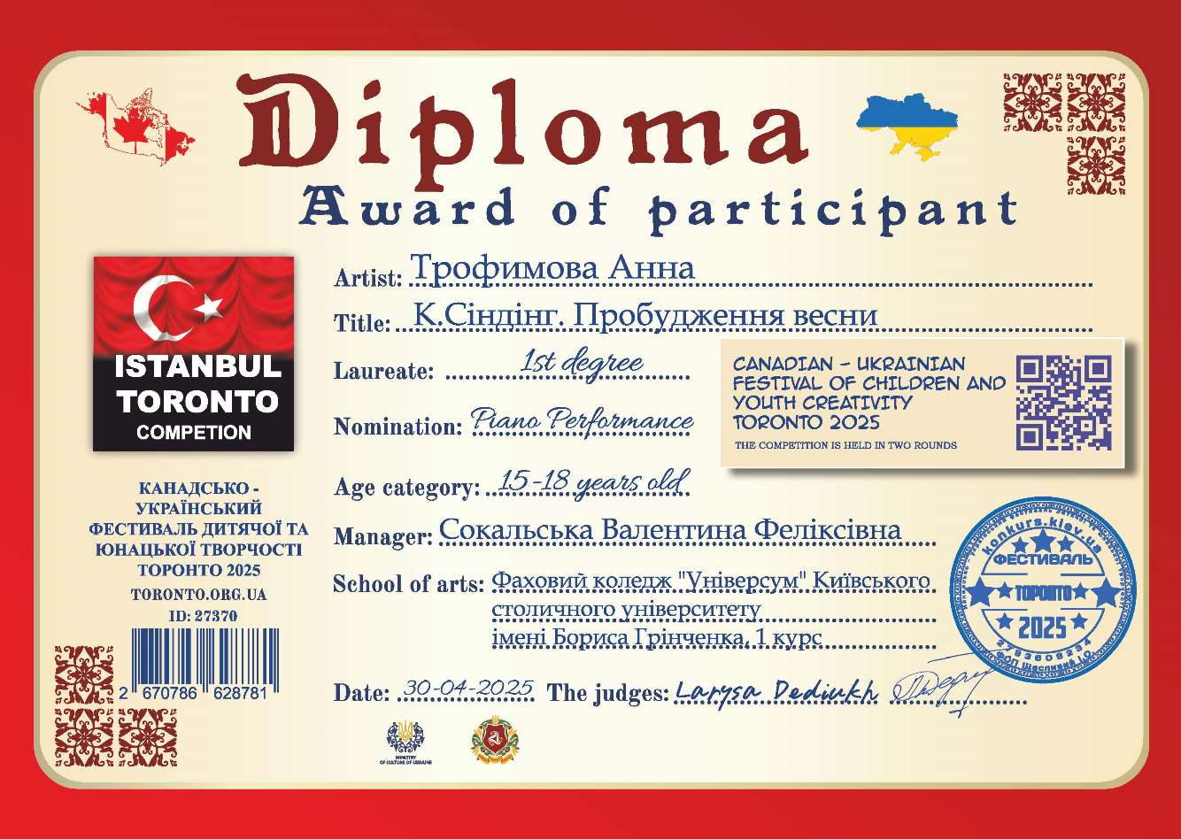 В квітні 2025 року студентка 1 курсу спеціальності «Музичне мистецтво» ТРОФИМОВА АННА взяла участь у міжнародному мистецькому конкурсі «POLSKA GWIAZDA» (Краків, Польща) та Канадсько-Українському фестивалі-конкурсі «ISTANBUL-TORONTO COMPLETION». В обох конкурсах студентка здобула перемогу і отримала дипломи І ступеня.