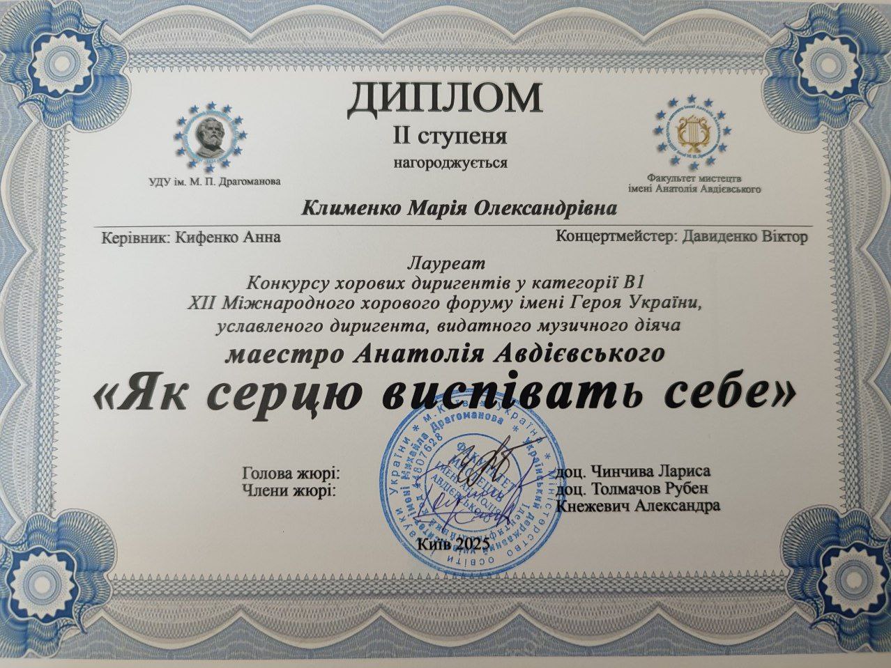 19 травня 2025 року на базі Українського державного університету імені Михайла Драгоманова пройшов ХІI Міжнародний хоровий форум імені Героя України, уславленого диригента, видатного музичного діяча маестро Анатолія Авдієвського «Як серцю виспівать себе».