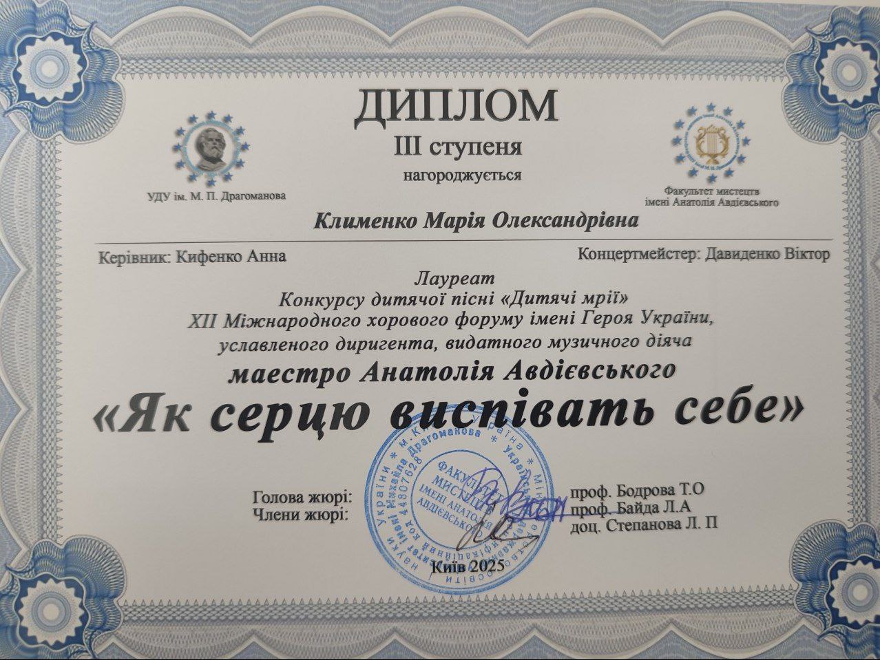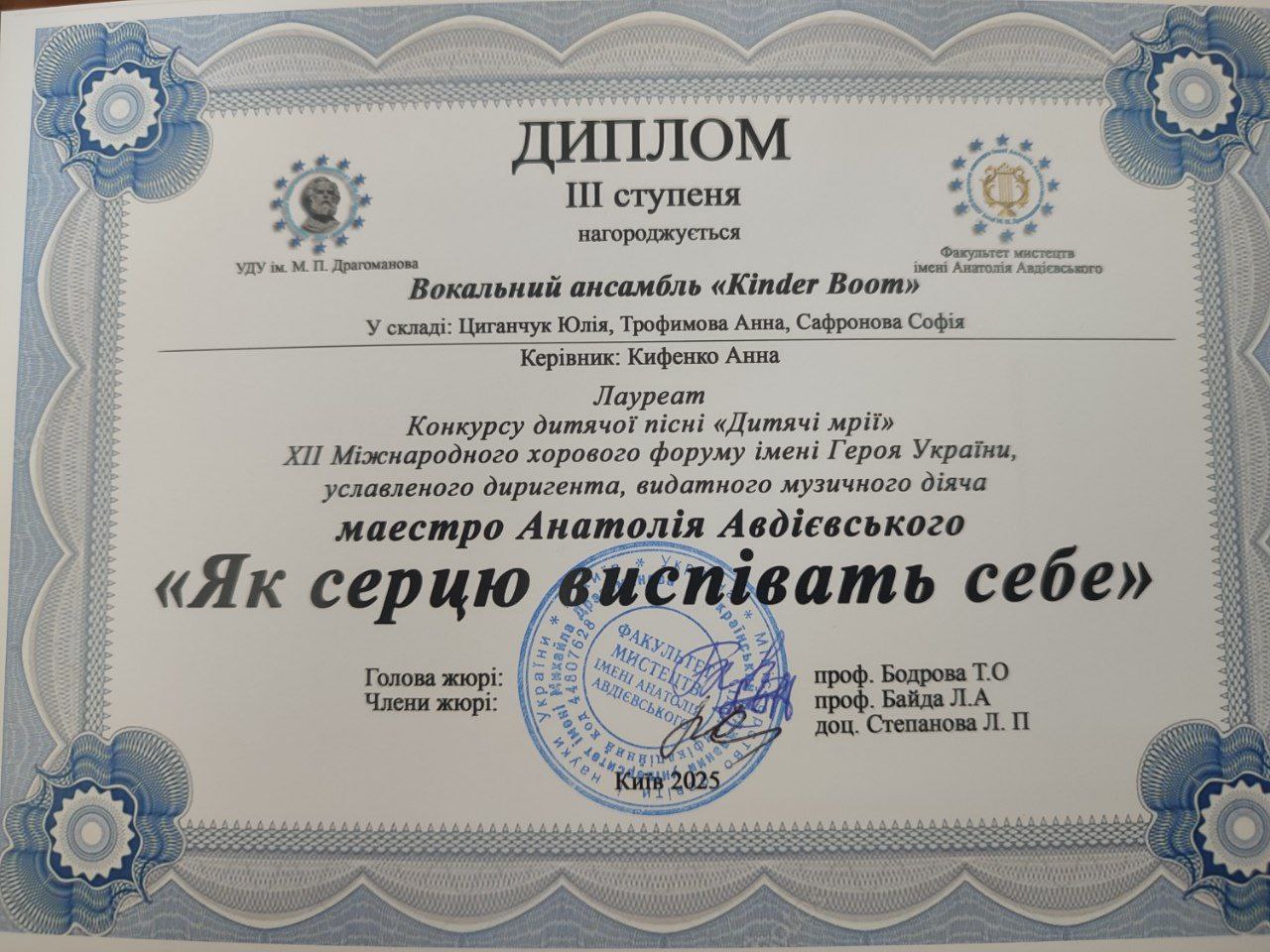 У конкурсі дитячої пісні «Дитячі мрії» вокальний ансамбль «Kinder Boom» у складі Софронової Софії, Циганчук Юлії та Трофимової Анни вибороли диплом лауреата III ступеня, Клименко Марія — диплом лауреата III ступеня (керівник — Анна Кифенко).