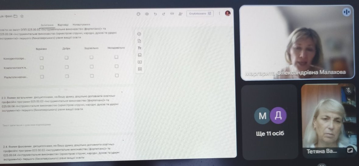 06.06.2025 року на кафедрі інструментально-виконавської майстерності Факультету музичного мистецтва та хореографії Київського столичного університету імені Бориса Грінченка відбулася зустріч членів робочої групи щодо розробки освітніх програм 025.00.03 Інструментальне виконавство (фортепіано), 025.00.04 Інструментальне виконавство (оркестрові струнні, народні, духові та ударні) першого (бакалаврського) рівня вищої освіти з представниками Ради роботодавців. Голова циклової комісії музики і хореографії Фахового коледжу «Універсум» Романова Т.В. взяла участь в цій зустрічі.
