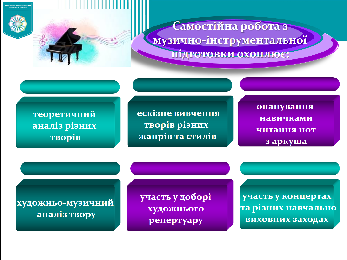 Більш детально доповідачка зупинилася на організації самостійної роботи здобувачів освітньо-професійної програми Музичне мистецтво, оскільки специфіка навчання, велика кількість індивідуальних занять вимагають особливого підходу до самопідготовки студентів.