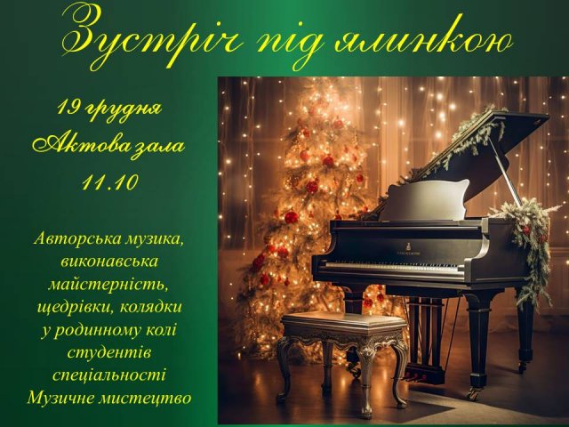 19 грудня 2025 року в актовій залі Коледжу відбувся концерт студентів спеціальності «Музичне мистецтво» «Зустріч під ялинкою». Особливістю заходу була умова, щоб кожен виконавець сам обрав жанр, стиль, напрям, в якому хотів презентувати свій виступ. В результаті глядачі почули авторську музику студентів, твори різних композиторів, класику і джаз, прозвучали сольні вокальні номери, інструментальні ансамблі різного складу, свої власні композиції виконав гурт "Дієслівні". І викладачі, і студенти відкрили для себе нові грані творчості для майбутньої співпраці. Концерт закінчили колядками і щедрівками, а також задонатили кошти на підтримку ЗСУ. Сьогоднішній захід став справжнім різдвяним святом та подарував натхнення на подальшу творчість усім членам нашої музичної родини.