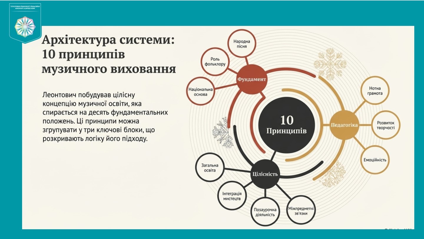 Микола Леонтович увійшов в історію не лише як автор геніального «Щедрика», а й як видатний педагог-практик; його підхід базувався на трьох «китах»: народна пісня, дитяче багатоголосся та глибоке розуміння психології дитини. Доповідачка акцентувала увагу на таких аспектах системи Леонтовича: