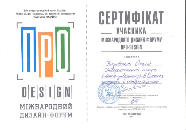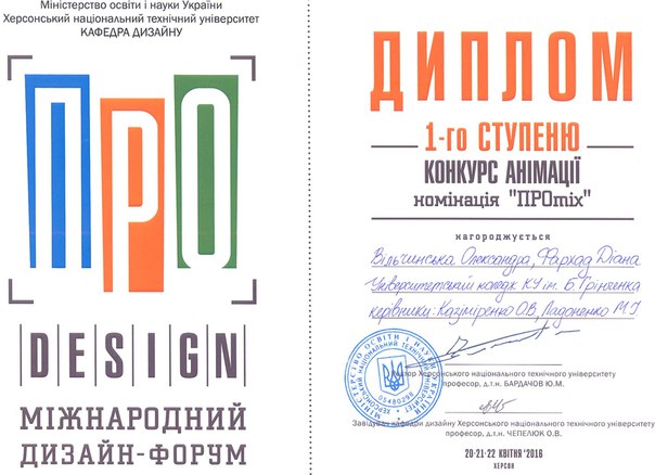 22 квітня 2016 року на базі Херсонського національного технічного університету відбувся Всеукраїнський конкурс анімації (Multiplex, ТРЦ FABRIKA). У конкурсі взяли участь студенти Університетського коледжу спеціальностей «Дизайн» та «Образотворче мистецтво» з анімаційними проектами «Тріумф невідомого» (Козловской Олексій, Черненко Анастасія, Калініченко Юрій, 4 курс, спеціальність «Дизайн»), «Суперстудент» (Соченко Людмила, Корякіна Єлизавета, Давиденко Дарина, 2 курс, спеціальність «Образотворче мистецтво»), «Один день з життя студента» (Фархад Діана, Вільчинська Олександра, випускники 2015 року, спеціальність «Дизайн»), «Історія одного художника» (Фархад Діана, Вільчинська Олександра, випускники 2015 року, спеціальність «Дизайн»), «Муки творчості» (Савич Дарина, 4 курс, спеціальність «Дизайн»). Модераторами проектів стали: Ладоненко М.І., Казіміренко О.В.