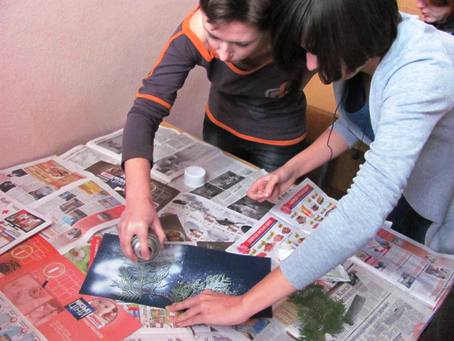 За допомогою гілочок та аерозольної фарби створити відбитки ялинки на папері – основу листівки.