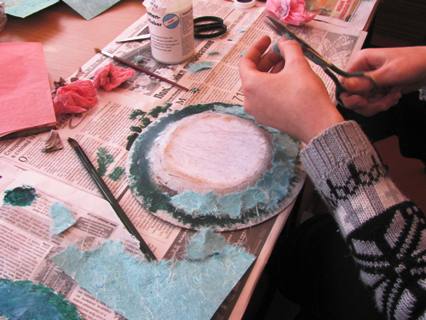 Після повного висихання фарби, наклеюємо на прозорі ділянки тонкий папір бірюзового кольору. Чекаємо, доки виріб повністю висохне. Після чого покриваємо всю тарілку густим шаром білої акрилової фарби, даємо висохнути.