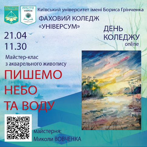 21 квітня 2021 року викладач циклової комісії образотворчого мистецтва і дизайну Вовченко Микола Павлович запросив всіх охочих приєднатись до мистецтва акварельного живопису під час майстер-класу "Пишемо небо та воду".