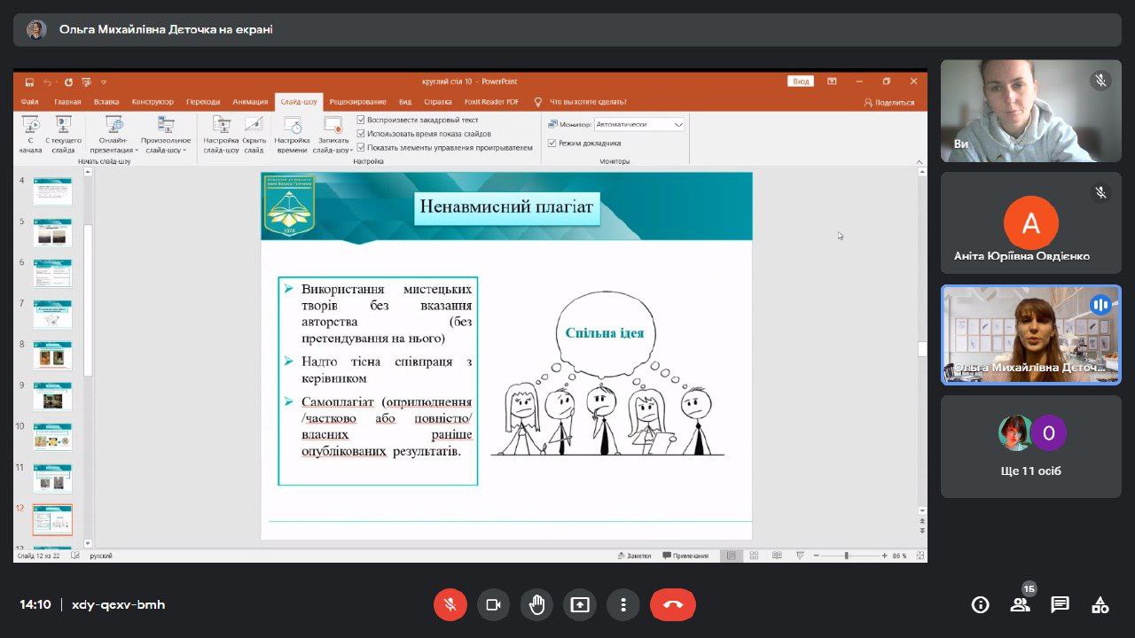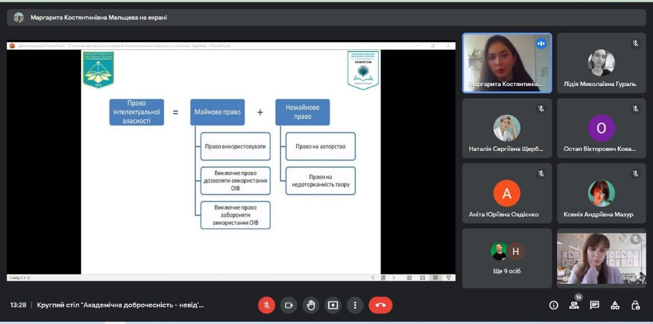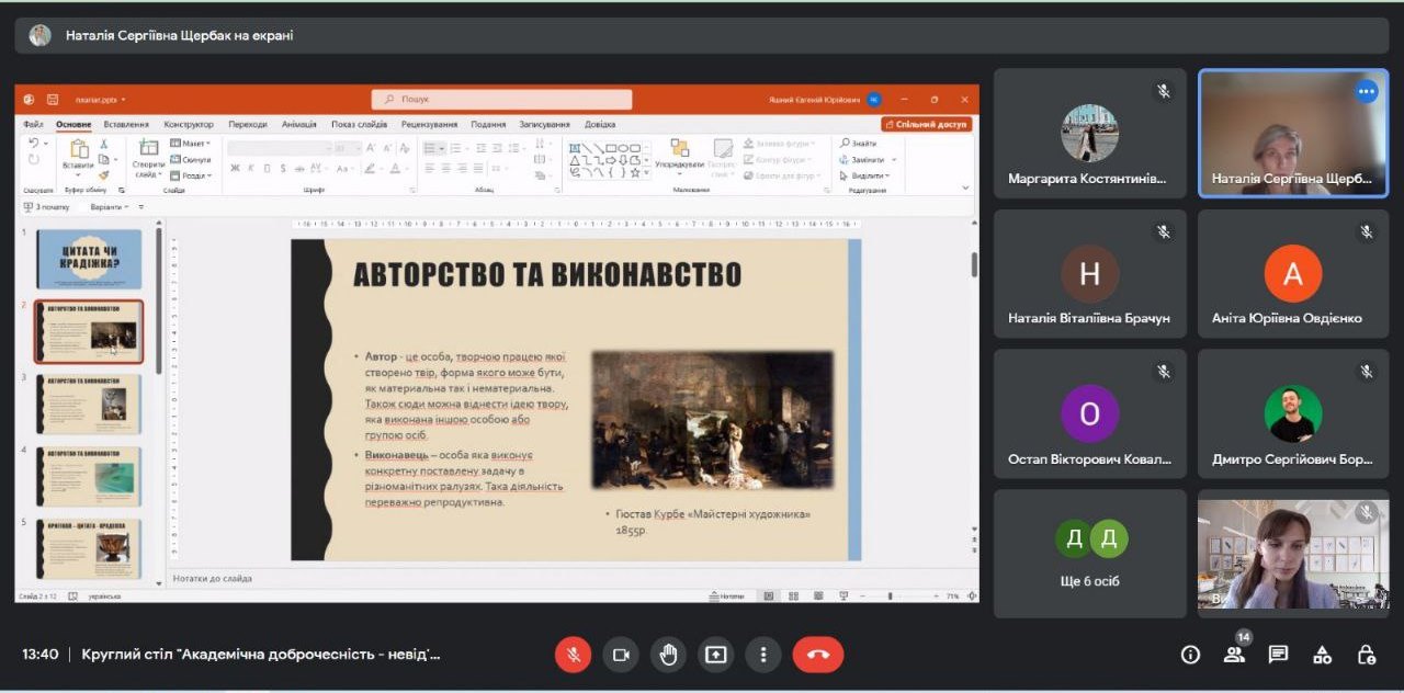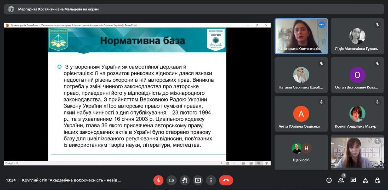 В межах круглого столу від Фахового коледжу “Універсум” виступили з доповідями викладач циклової комісії образотворчого мистецтва і дизайну Наталія ЩЕРБАК та студентка 4 курсу спеціальності “Правознавство” Мальцева Маргарита, яка закцентувала увагу на юридичних аспектах інтелектуальної власності, юридичної відповідальності та прав митців.