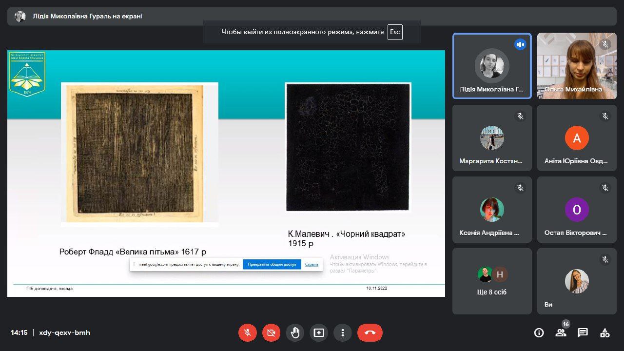 10 листопада 2022 року у межах Всесвітнього Дня науки – 2022 за ініціативи Факультету образотворчого мистецтва і дизайну Київського університету імені Бориса Грінченка відбувся Круглий стіл «Академічна доброчесність, як невід’ємна складова сучасного українського мистецтва» за участі Наукового товариства факультету образотворчого мистецтва і дизайну та Фахового коледжу "Універсум".