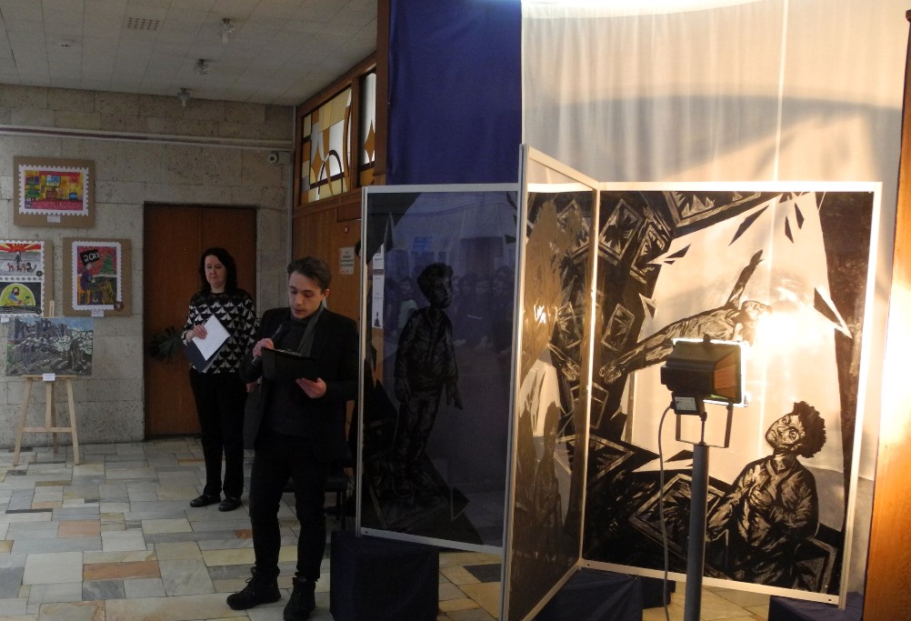 Також на виставці презентовані дитячі роботи вихованців Центру позашкільної роботи Святошинського району та інсталяція молодого митця “Діти війни”.