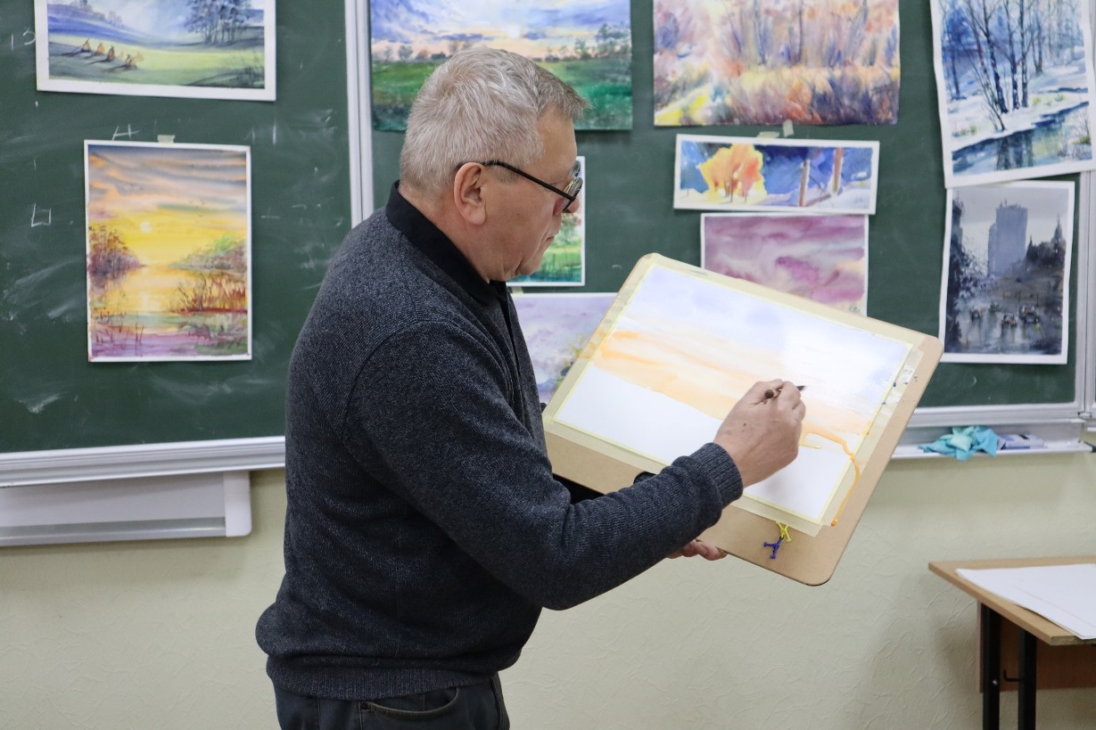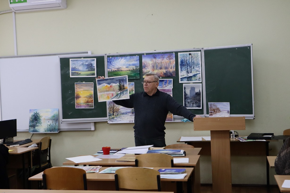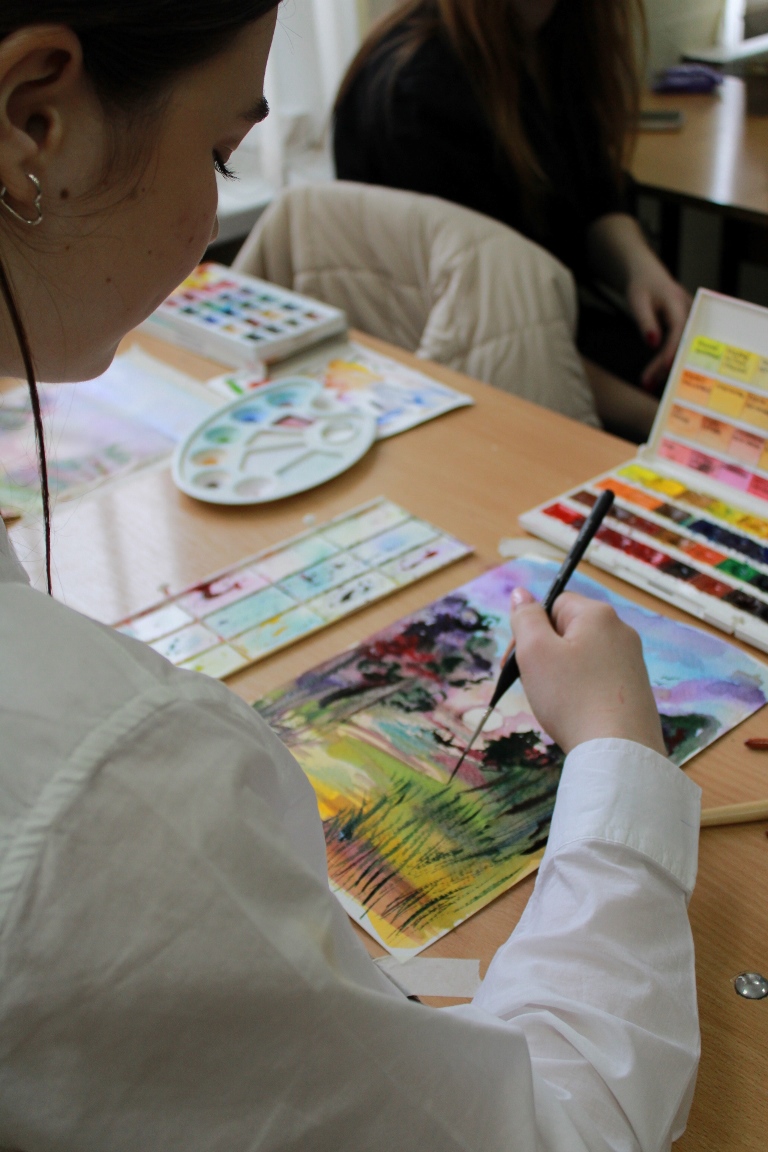 Студенти коледжу, а також всі гості не лише дізнались про особливості підбору матеріалів, та інструментів для виконання акварельного живопису, а також разом з майстром створили власні пейзажі засобами акварельного живопису.