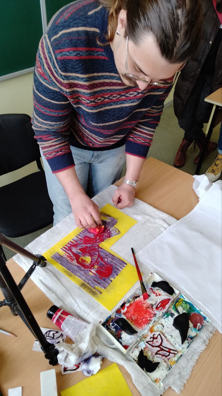 Ця зустріч дала можливість студентам і викладачам ознайомитись з особливостями техніки виготовлення штампу і виконання друку на тканині. Також ми обговорювали, які матеріали можна використовувати для роботи в цій техніці, які розповсюджені проблеми можуть виникнути в процесі роботи та як їх уникнути.