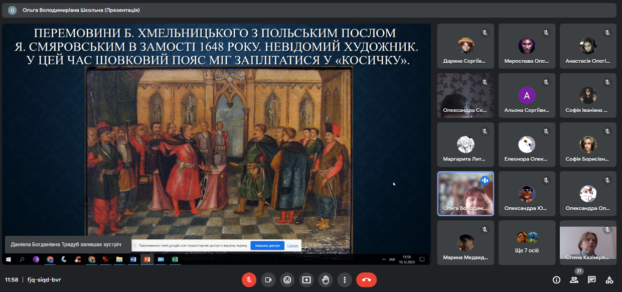 15 грудня 2023 року в межах співпраці з Факультетом образотворчого мистецтва і дизайну Школьна Ольга Володимирівна, доктор мистецтвознавства, професор, завідувач, професор кафедри образотворчого мистецтва Київського університету імені Бориса Грінченка, прочитала для студенток і студентів Фахового коледжу “Універсум” лекцію на тему: “Шовк в художній культурі України ХVІ- початку ХХ століть”.