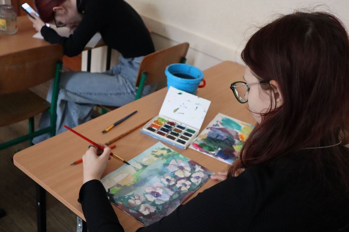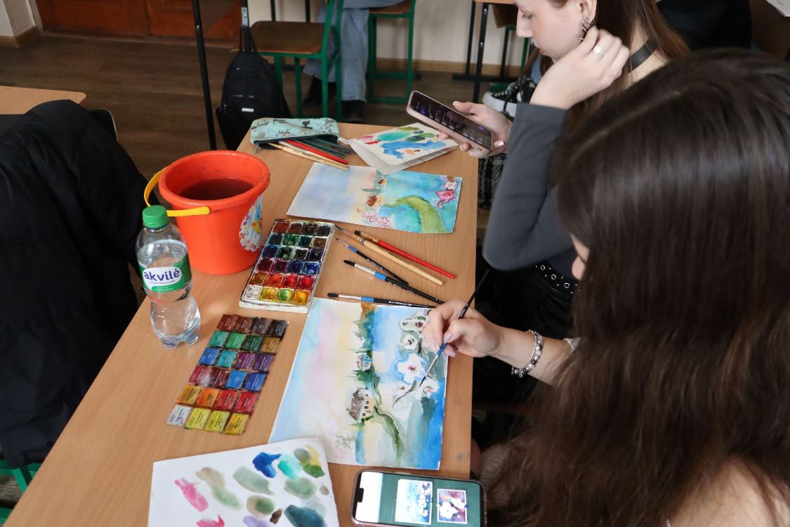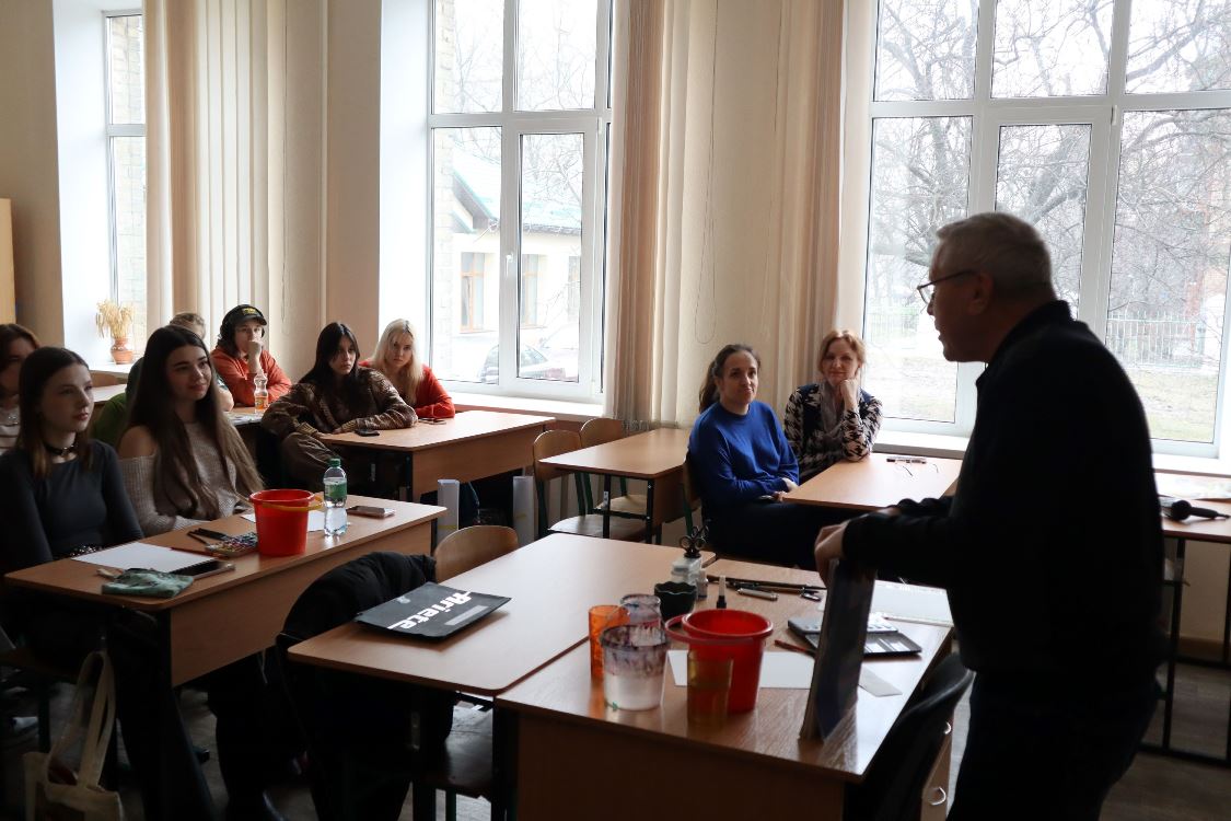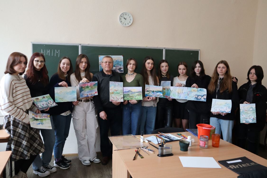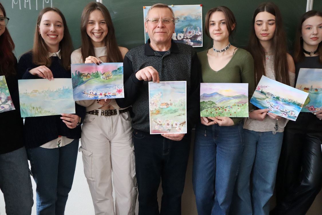 6 березня 2024 року викладач циклової комісії образотворчого мистецтва і дизайну Фахового коледжу “Універсум” Київського столичного університету імені Бориса Грінченка Микола ВОВЧЕНКО провів майстер-клас з акварельного живопису “Садок вишневий коло хати…”.