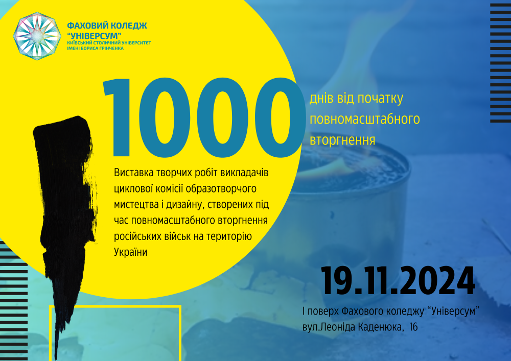 19 листопада 2024 року на першому поверсі Фахового коледжу “Універсум” Київського університету імені Бориса Грінченка, викладачі циклової комісії образотворчого мистецтва і дизайну презентували виставку власних творчих робіт створених під час повномасштабного вторгнення російських військ на територію України “1000 днів від початку повномасштабного вторгнення”