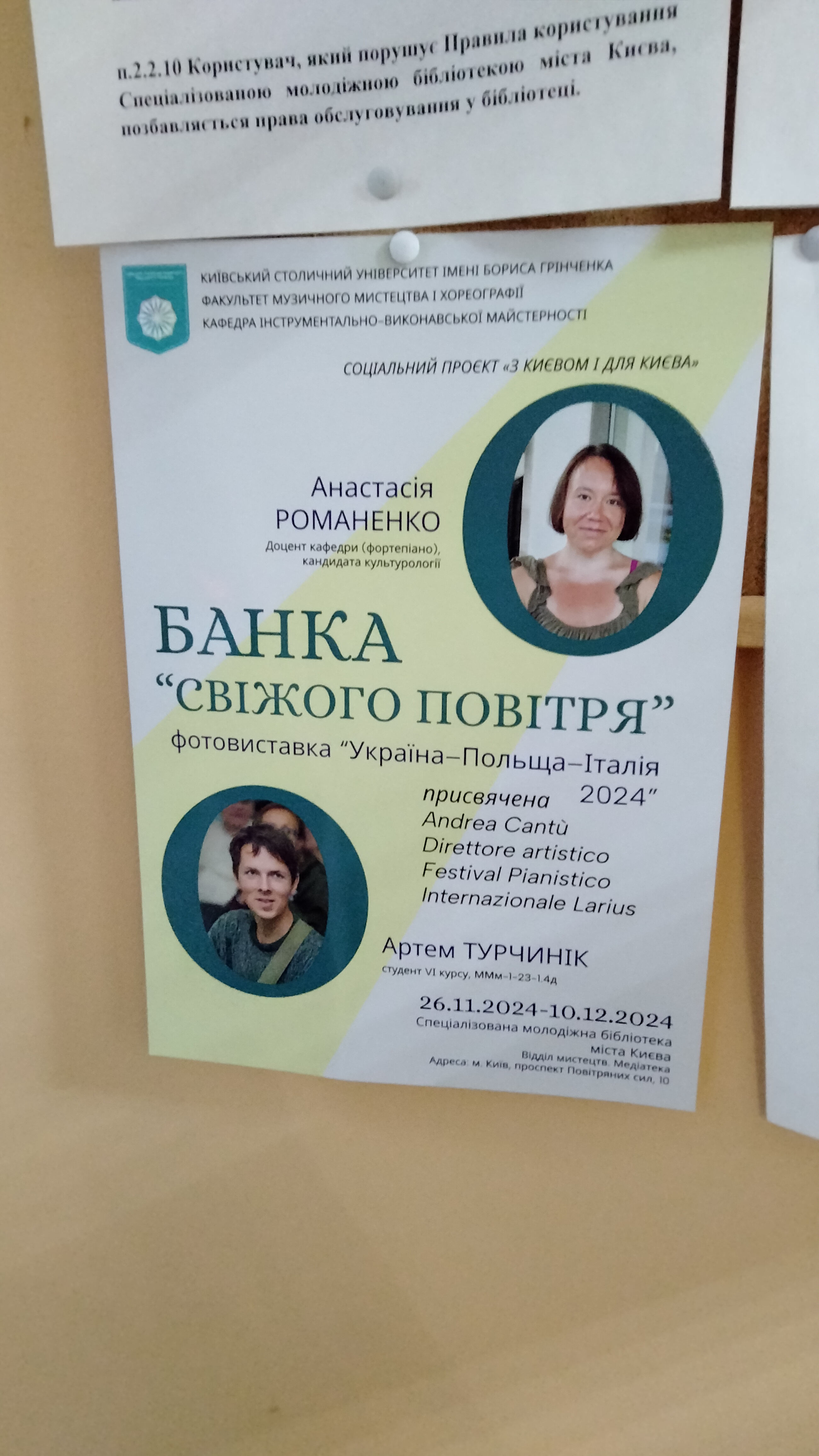 26 листопада 2024 року в приміщенні Спеціалізованої молодіжної бібліотеки міста Києва відбувся концерт “До світла” магістра Кафедри інструментально-виконавської майстерності Факультету музичного мистецтва і хореографії Київського столичного університету імені Бориса Грінченка Артема Турчиніка під керівництвом Романенко Анастасії, доцента кафедри (фортепіано), кандидата культурології, а також їх спільна фотовиставка “Банка “Свіжого повітря” .