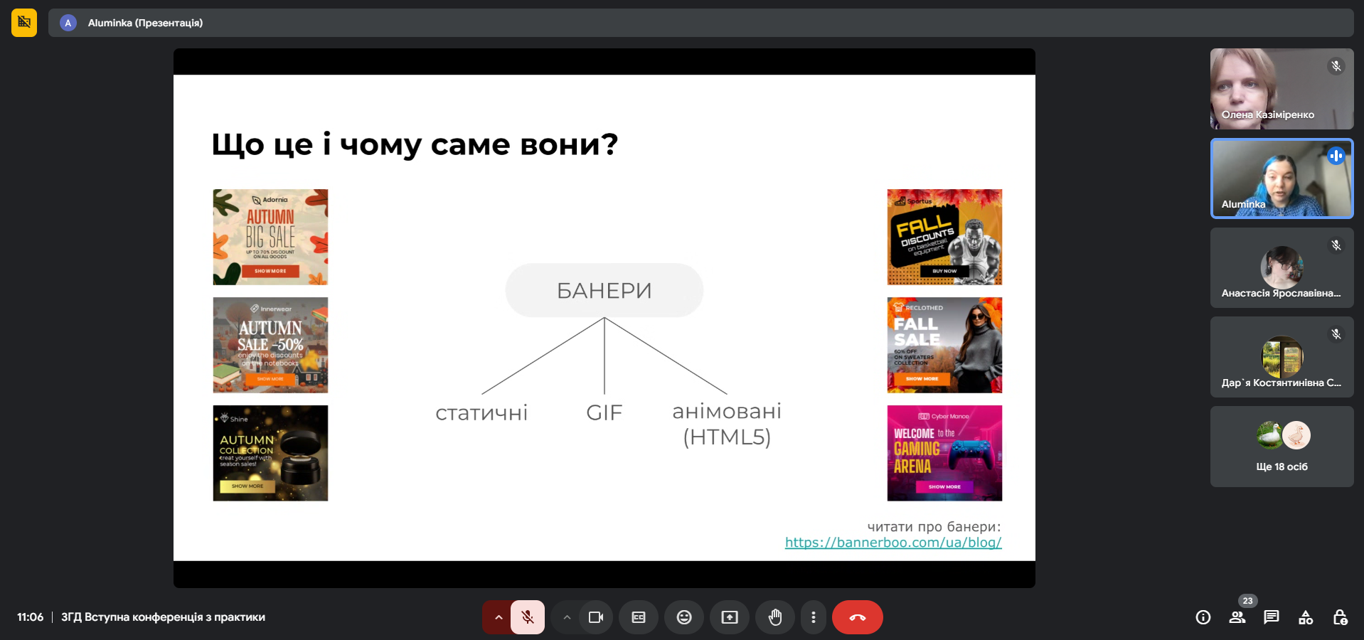 Під час майстер-класу дизайнерка окреслила місце анімованих банерів в рекламних компаніях, представила на прикладі власної розробки, процес виконання замовлення від отримання технічного завдання до подачі готового результату. Презентувала ряд безплатних онлайн-сервісів, які стануть в пригоді молодим дизайнерам під час виконання подібного завдання.