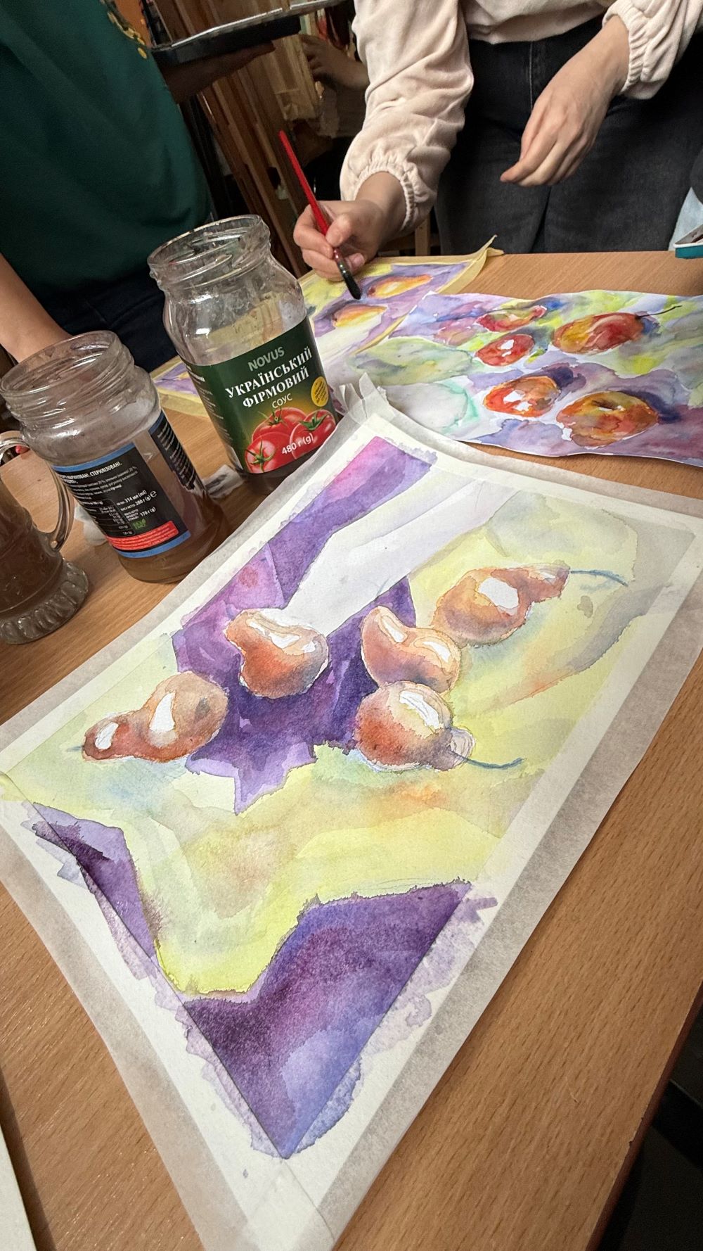Ми зосереджувалися на тому, як передати об'єм та фактуру за допомогою акварелі, як не боятися чистоти кольору та як знаходити гармонійні кольорові поєднання. Було дуже приємно бачити, як студенти поступово долали свої страхи перед цим ніжним, але водночас виразним матеріалом.