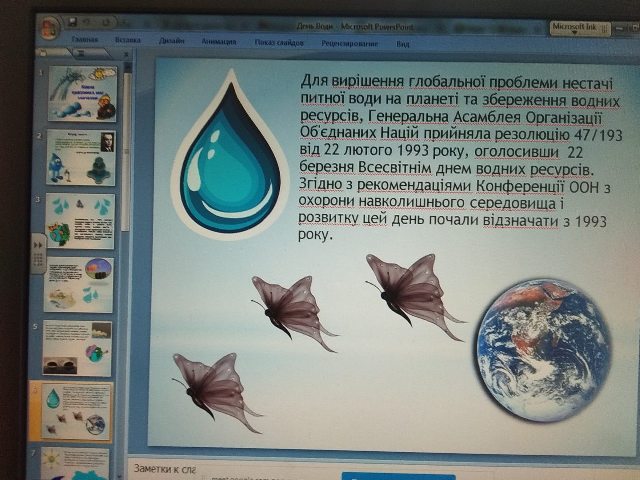 Студенти ознайомились з загостренням проблеми забезпечення людства питною водою, статистичними даними про наявність водних ресурсів у світі та в Україні, переглянули відеофільм "Вода в житті людини" та цікаві відеоролики "33 цікавих факти про воду", "Нестача і забруднення питної води".